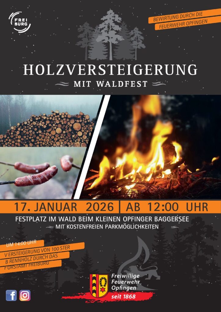 Am 17. Januar 2026 konnten wir wieder zahlreiche Gäste zur traditionellen Holzversteigerung mit Waldfest am Festplatz am Wangener Weg begrüßen. Die winterliche Stimmung rund um den kleinen Opfinger Baggersee verlieh der Veranstaltung eine besondere Atmosphäre und machte den Tag zu einem schönen Erlebnis für alle, die vorbeischauten.
