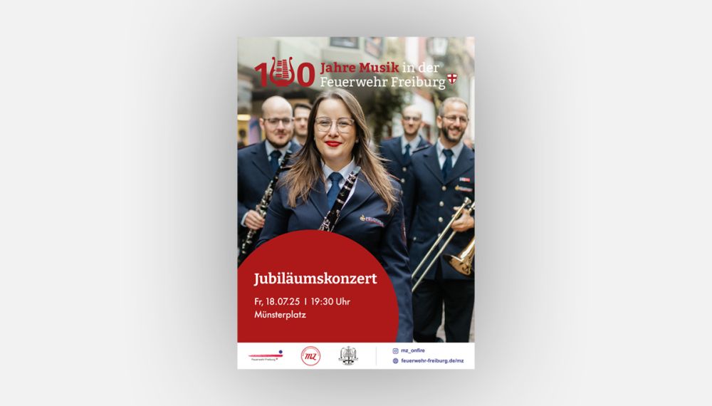 Am 18.07.2025 feiern wir 100 Jahre Musik in der Feuerwehr Freiburg mit einem Konzert auf dem Freiburger Münsterplatz.