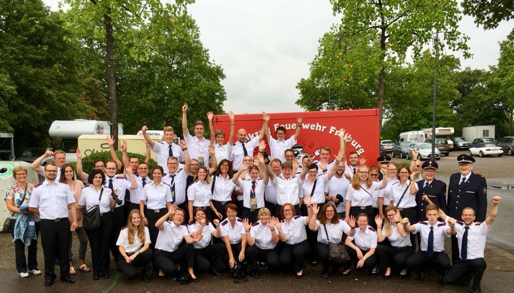 „Die Damen und Herren auf dem Foto freuen sich zu Recht: Der Musikzug der Feuerwehr Freiburg hat bei den Landeswertungsspielen in Heidelberg den dritten Platz in der Orchesterwertung und im gleichen Zuge die goldene Medaille beim Bühnenspiel der Mittelstufe errungen. Die 40 Musikerinnen und Musiker…